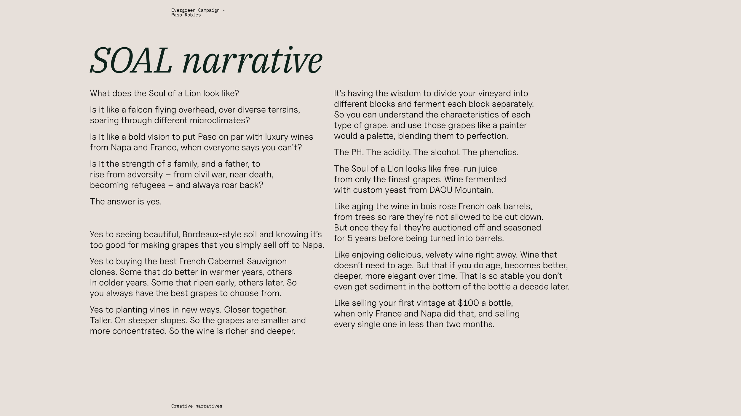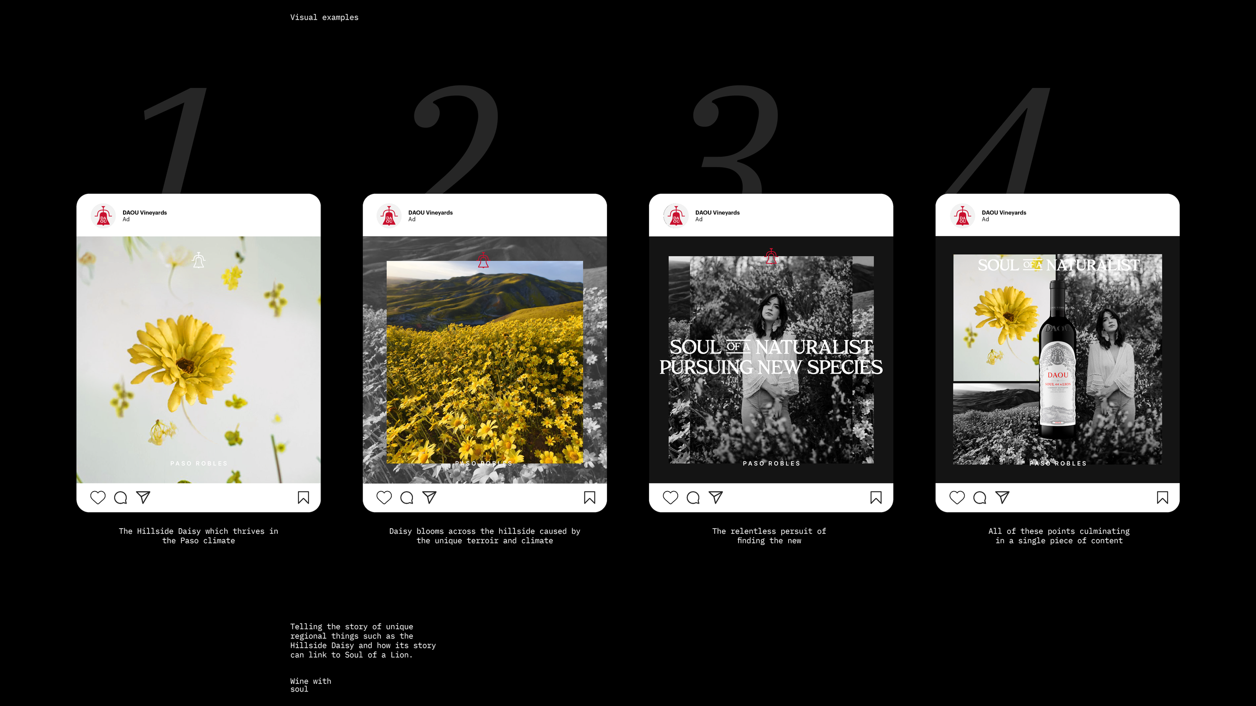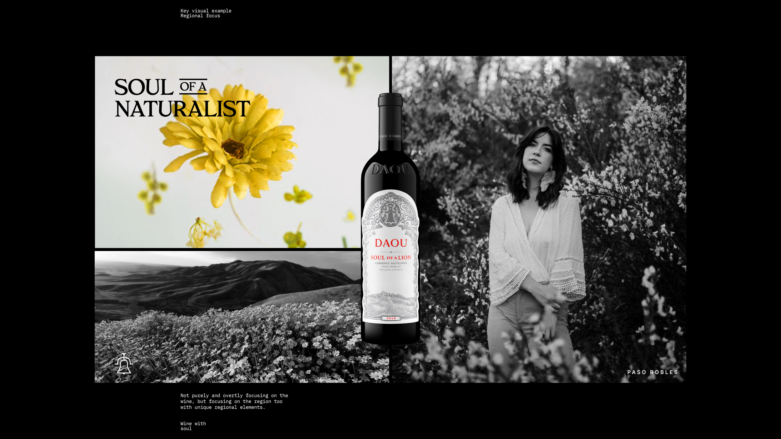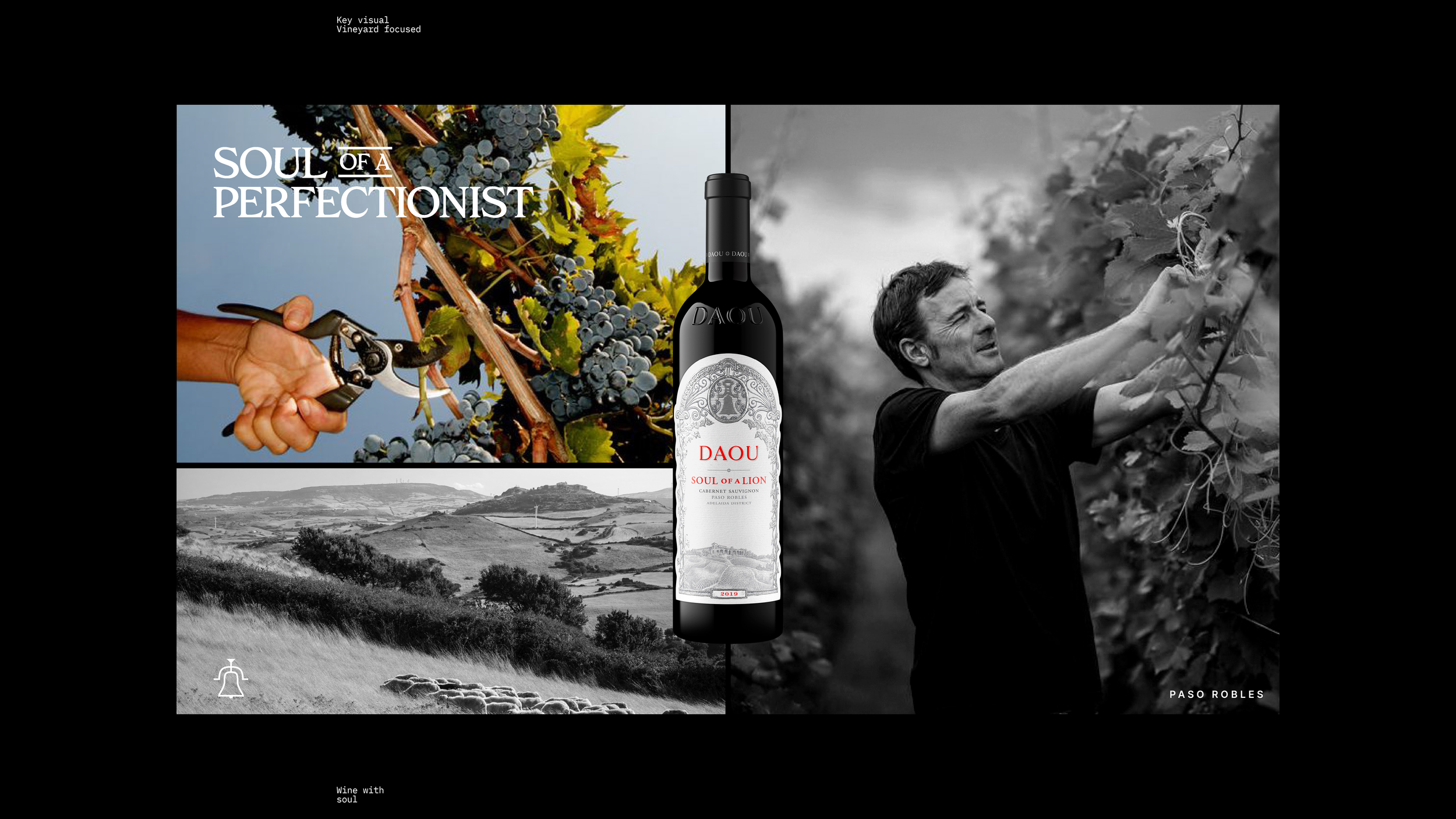 From there, we created our overarching campaign theme ‘Untameable Spirit’, which speaks to the untameable nature of the land and the wine itself. Within this overarching campaign, we then developed a series of bespoke campaigns for individual DAOU wines. The one you see here, ‘Wine with Soul’, is for their Soul of a Lion (SOAL) wine, which likens SOAL to people with great spirit and determination.